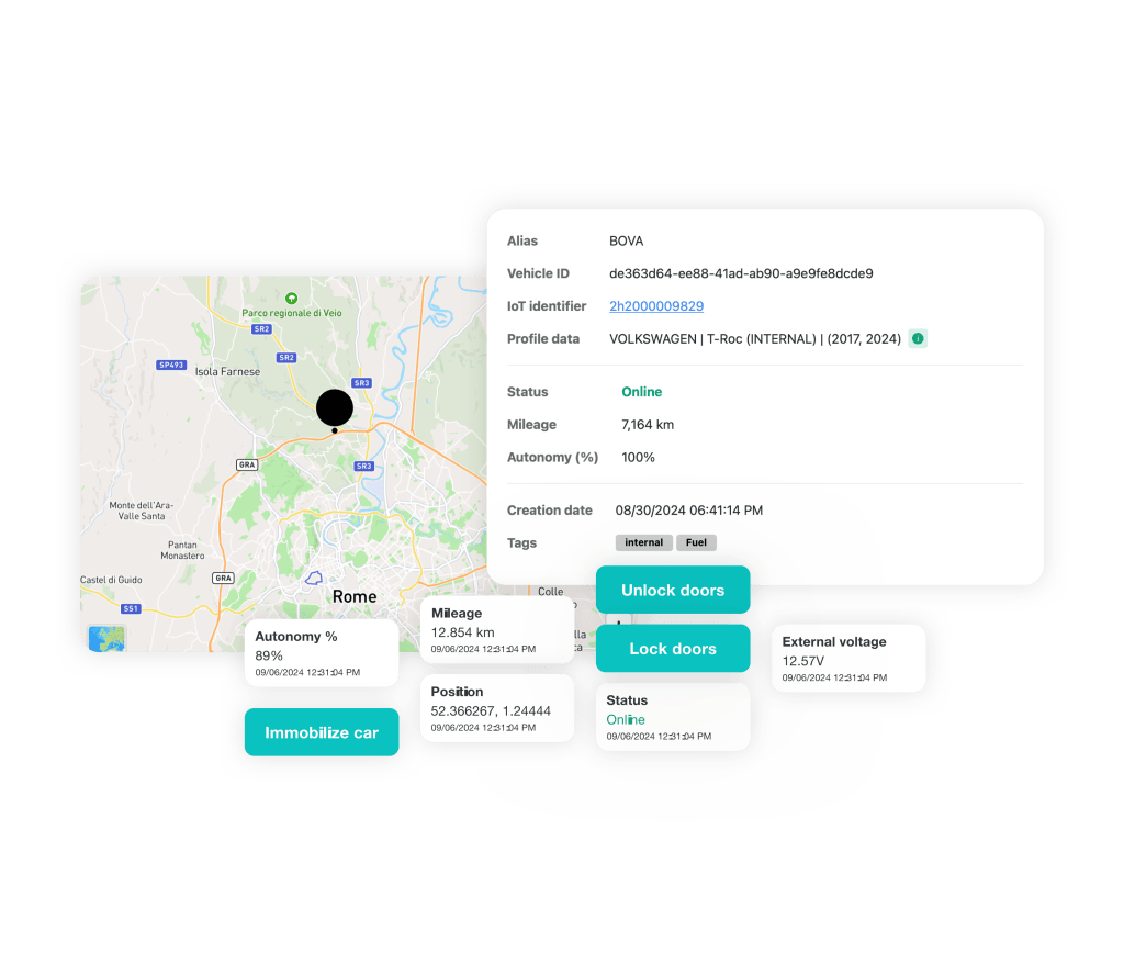 Enjoy a single interface for secure vehicle commands and real-time data — from door control, GPS, and engine immobilizer to fuel, battery, and unified telemetry ready to integrate into your apps for faster launches.